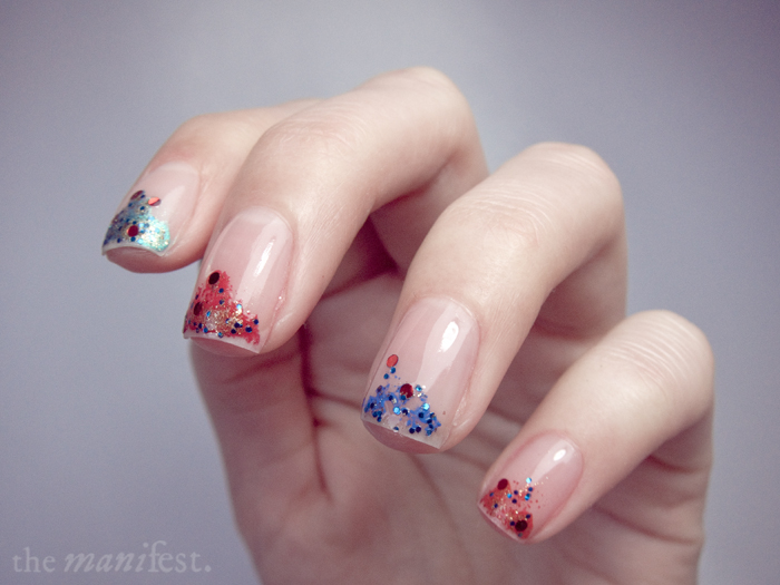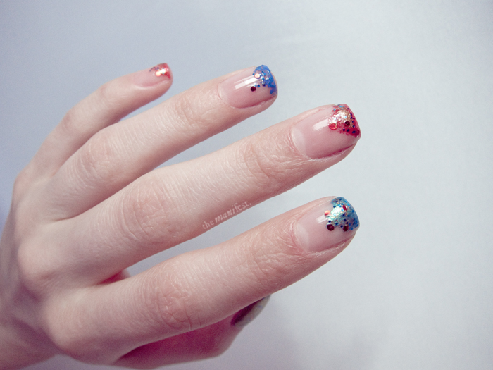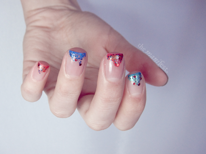 I dabbed some of each corresponding base colour onto the tips, applied some top coat, and wore this as a full mani for a few days. What do you think? I really liked it, the golden shimmer that remained still held the blue and the red together, but didn’t cover the glitter. Totally unexpected manicure.