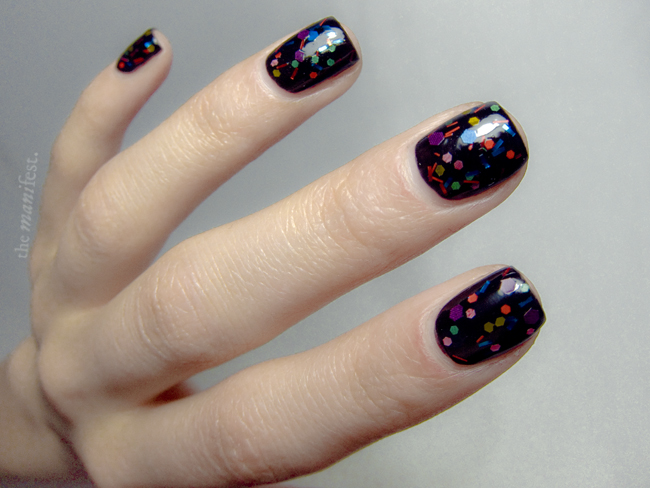 The base being tinted black makes this polish almost impossible to layer on any other colour than black. It needs about 3 coats to be opaque by itself, but in my opinion that many coats would kill the confetti-effect by an overdose of glitter.