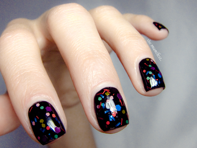 This is one coat of Black Friday on a regular black creme. I used the dabbing method and topped with Seche Vite. The yellow glitter and the blue bar glitter tends to drown a bit in the black base, but not completely.