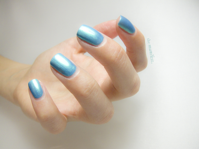 Aptly named. Baby blue, pearl finish with a metallic feel. There is a slight green tinge that doesn’t show in the bottle but makes the end result both soft and icy. Two coats.