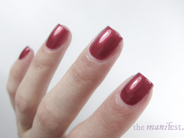 Cuccio Moscow Red Square 2 coatsCuccio Moscow Red Square 2 coatsMoscow Red Square is a red raspberry-leaning shimmer. Looks warmer in the bottle than it does on the nail. Very sweet and mild as reds go, neither christmassy nor vampy. Feels a bit like stained glass. This is two coats plus topper.